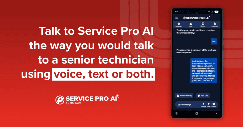 Technicians speak or text with the AI app on their mobile device about the specific issue they’re troubleshooting. Service Pro AI provides answers based on your equipment manuals and job history. It supports techs while work is happening, then automatically captures service information as a byproduct of completing the job – no extra steps or paywalls between you and your report.