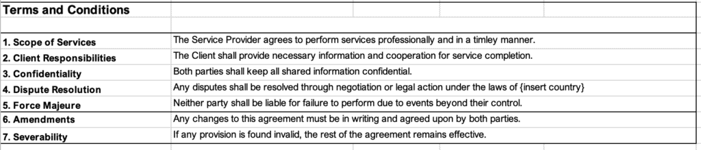 Next up is the Terms & Conditions section. There is no need to fill anything out here. This section serves as an agreement between the customer and your service company. Again, these are in place as a foundation, so feel free to customize to your exact needs.