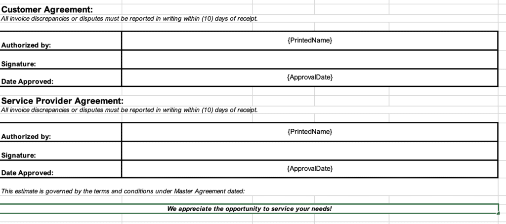Now we can move on to the last section in the template. This is where you’ll collect signatures from your company’s representative and your customer. Make sure to sign, date, and adhere to the 10-day change/dispute reporting process (or change the time frame as you wish).